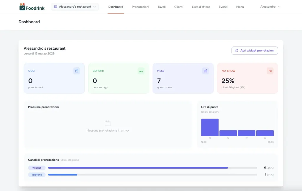 Controlla prenotazioni, coperti, no-show e ore di punta direttamente dalla dashboard. Tutto in tempo reale, sempre aggiornato.